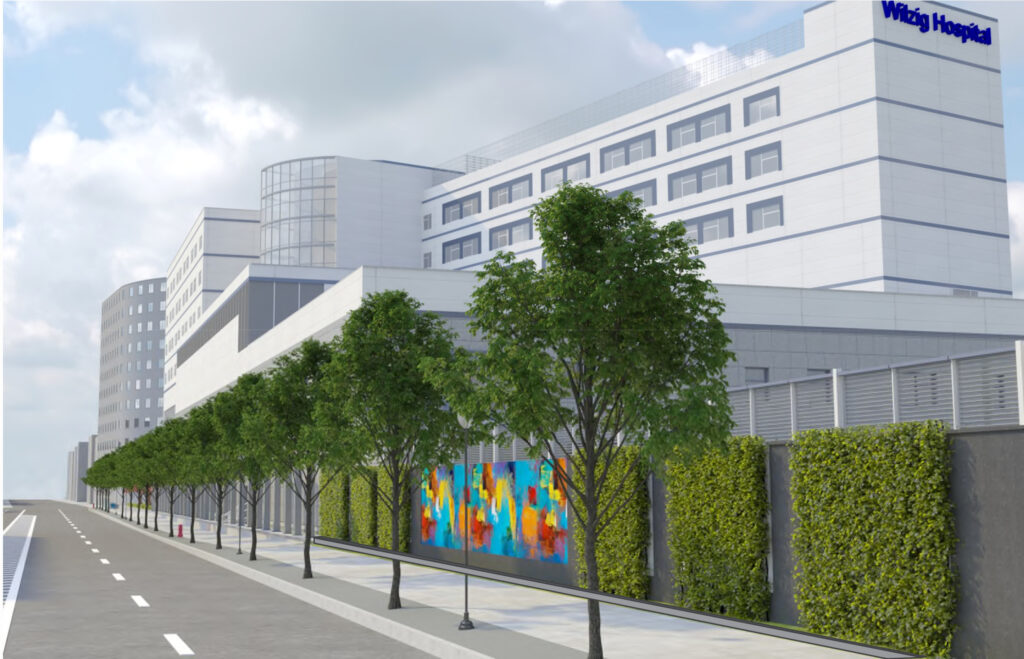 The selected artwork will be printed and installed on the exterior flood wall of the main Jersey City Medical Center building on Grand Street. The JCMC Arts Program covers all expenses for the print production and mounting of your artwork onto the flood wall.